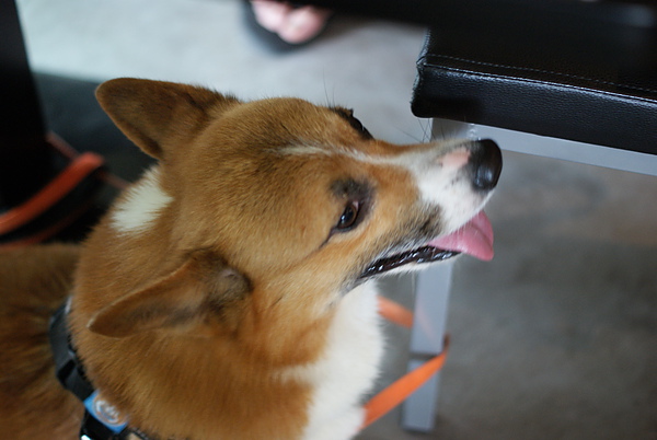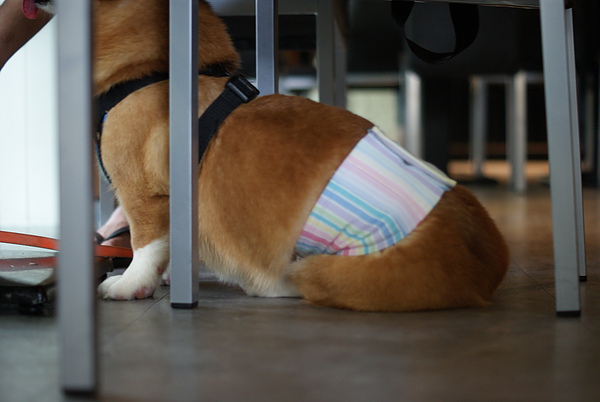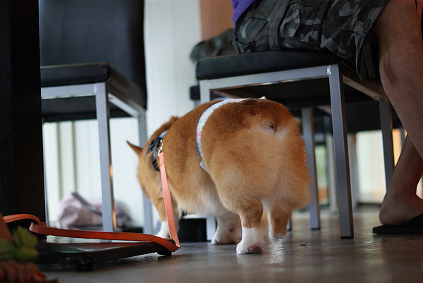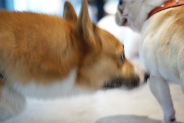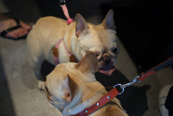 這天,店中前半段有紅貴賓慶生派對,之後又來了2隻一公一母的法鬥,就在我們隔壁桌;小P一進來還是保持著愛串門子的熱情,但這小倆口完全不買帳,自顧自地打情罵俏了起來,讓小P在一旁看傻了眼~